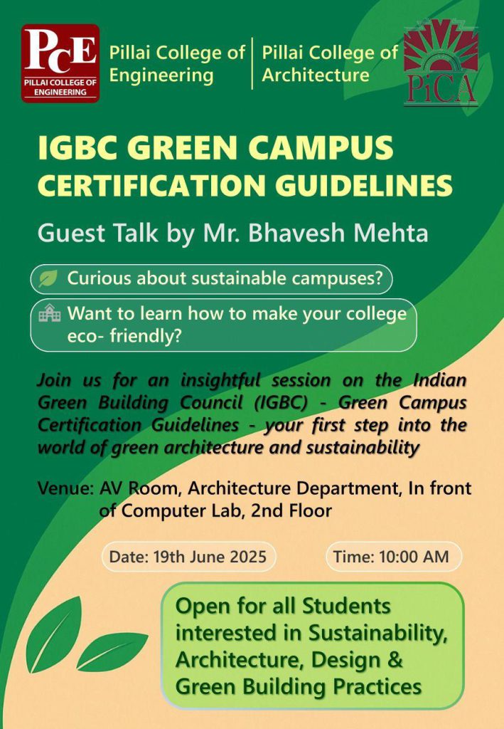 The guest lecture titled “IGBC Green Campus Certification Guidelines” was conducted on 19th June 2025 at 10:00 a.m. in the AV Room of the Architecture Department. The session was jointly organized by Pillai College of Engineering and Pillai College of Architecture under their sustainability awareness initiative. The event was open to students across disciplines, particularly those interested in sustainable design and green building practices.