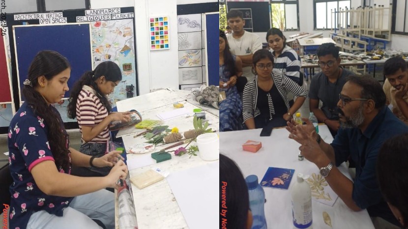 Prof. Aarti Mankame conducted an interactive lecture that introduced students to observing natural elements such as leaves, flowers, twigs, shells, and pebbles. The session focused on understanding their geometric forms, shapes, textures, and colours, emphasizing how these parameters influence visual composition and abstraction in design.
