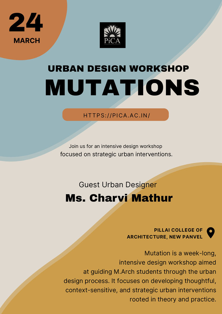 The Mutation – Urban Design Workshop was held from 23rd to 29th March, 2025 at Pillai College of Architecture, New Panvel. It was a week-long workshop designed for M.Arch. (Urban Design) students. The event began with a detailed session by the guest expert, followed by a week of independent student project development, culminating in final presentations.