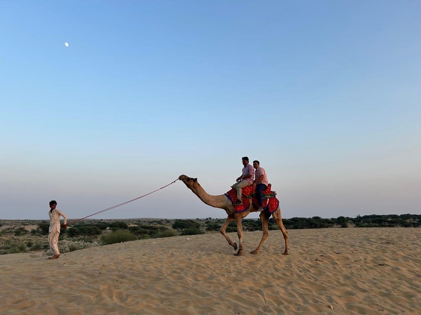 The first half of the day was dedicated to local sightseeing in Jaisalmer, including visits to Patwa Haveli, a cluster of ornately designed merchant homes, and a final overview of Jaisalmer Fort. After lunch, the group departed for Sam, located about 45 kilometers away. On the way, they visited the Rajkumari Ratnavati Girls’ School, a notable architectural project in the desert. On reaching Sam Sand Dunes, they enjoyed a camel ride across the golden dunes at sunset. The evening featured a vibrant Rajasthani folk dance performance and a traditional dinner. Overnight accommodation was in desert tents.