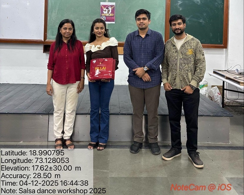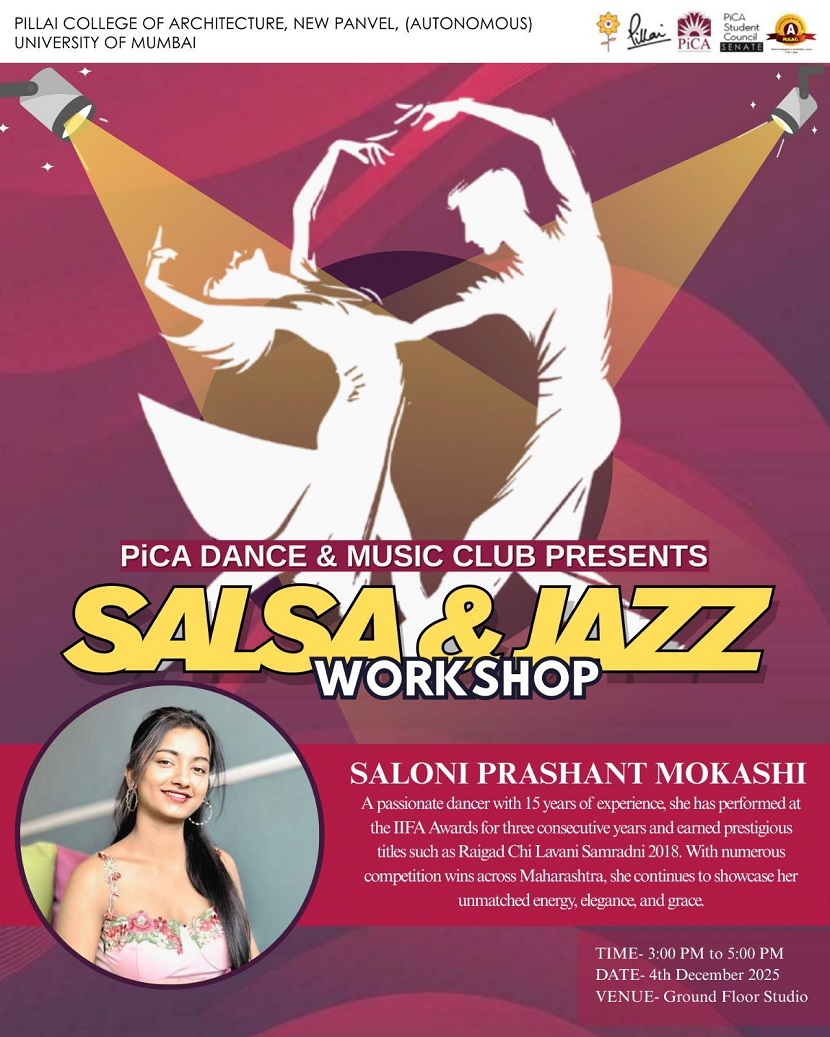 The Dance and Music Club of PICA organized a vibrant Salsa & Jazz dance Workshop on 4th December 2025, led by renowned choreographer and dancer Saloni Mokashi, winner of the Raigadchi Lavani Samragni Competition and a recurring performer at the IIFA awards. A total of 29 students attended the workshop. It was held from 3:00 PM to 5:00 PM, in the Ground floor studio and drew enthusiastic participation from students across diverse disciplines, reflecting the institute’s commitment to nurturing creativity, expression, and physical well-being.